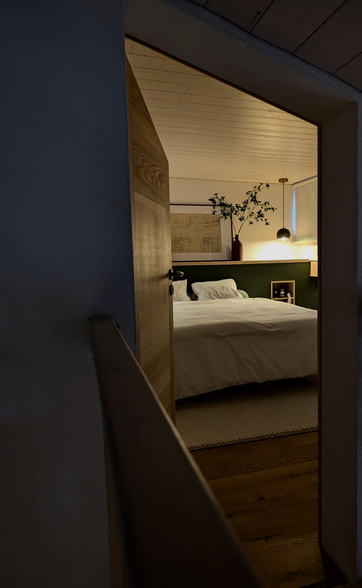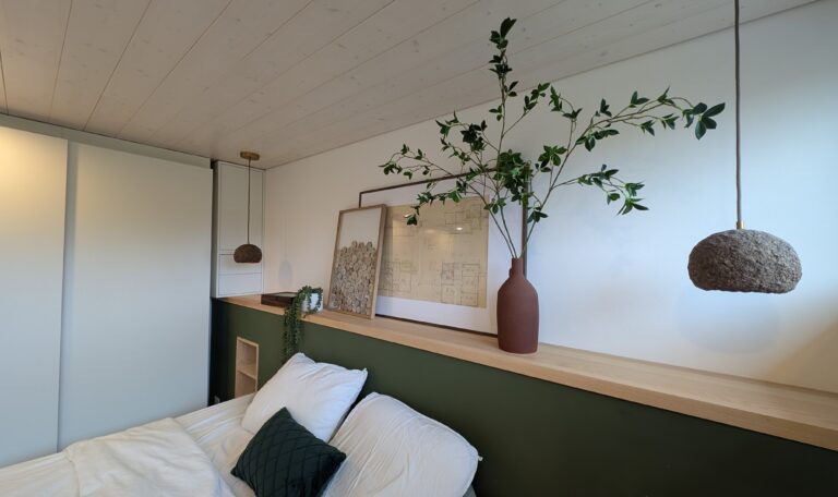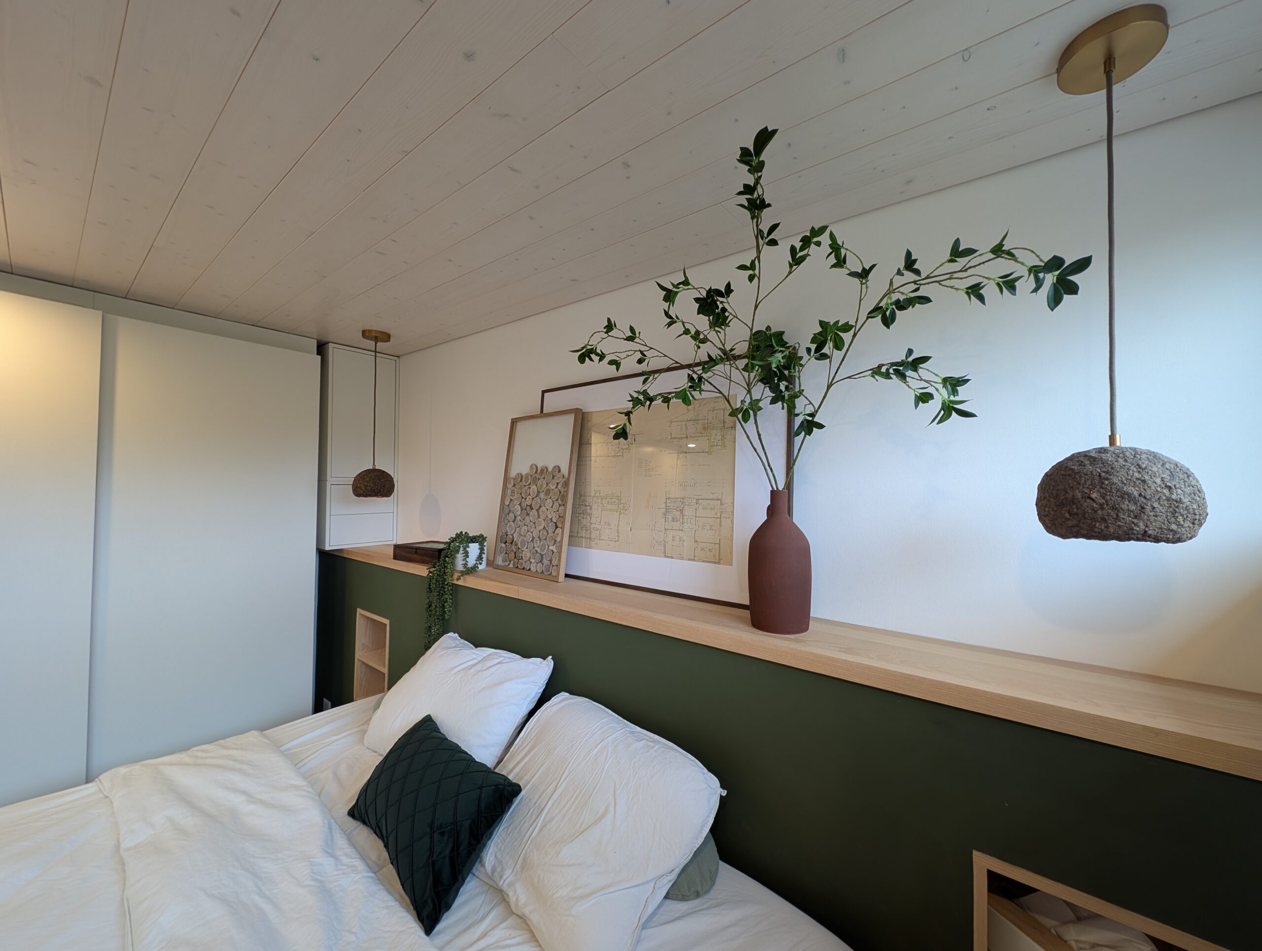 Le point de départ du projet : leur tête de lit verte avec niche en bois, qu’ils avaient eux-mêmes fabriquée. Inspirée par le style retenu, ma cliente a ensuite réalisé elle-même les lampes, apportant une touche personnelle et artisanale qui sublime encore davantage l’ensemble. Nous avons construit toute l’atmosphère autour de ces éléments uniques, afin de créer un espace à la fois apaisant, équilibré et raffiné.