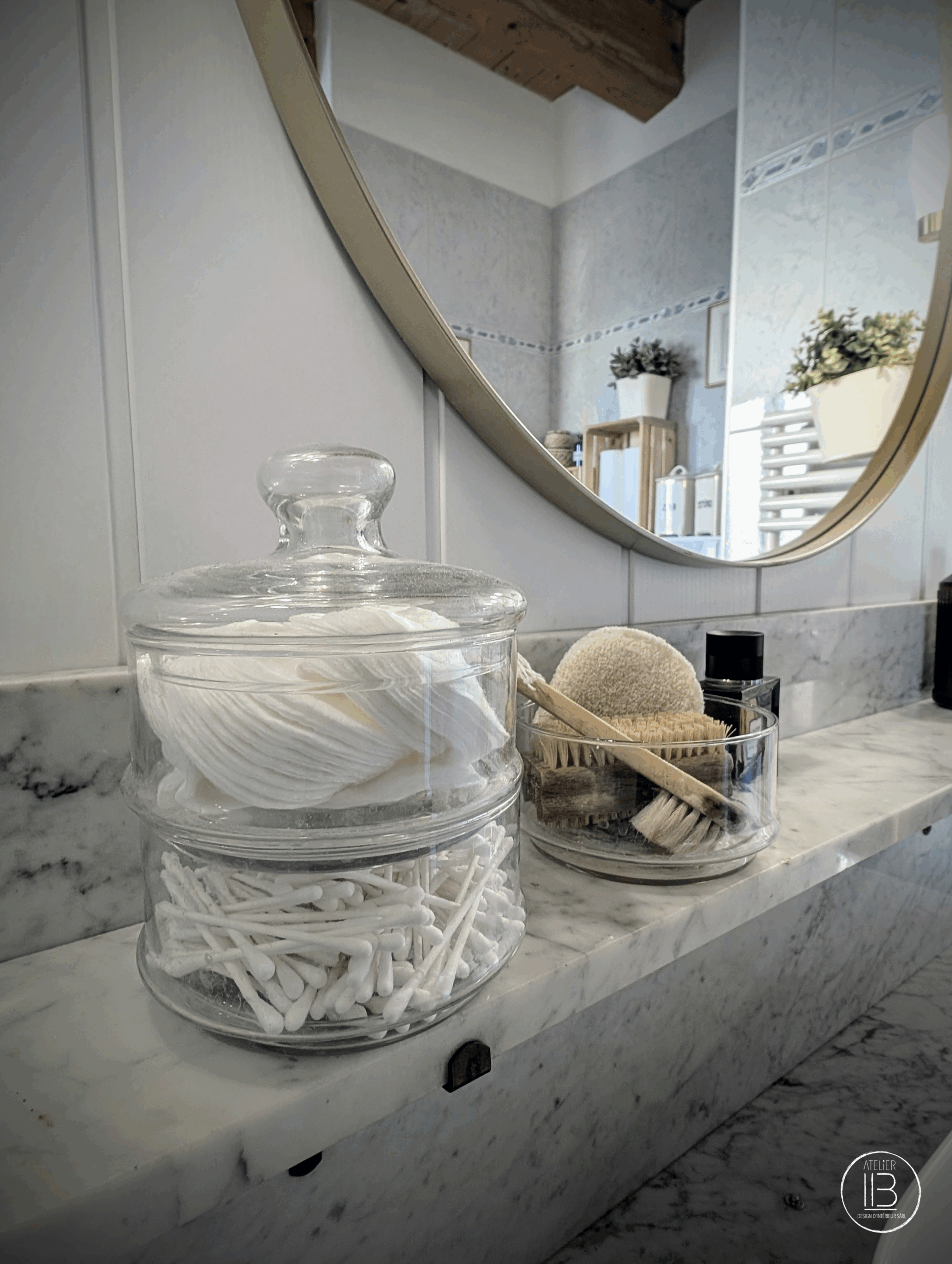 Le meuble lavabo standard a laissé place à une élégante commode surmontée d’un plateau en marbre, où trône une vasque posée, alliant charme et raffinement. Un miroir rond doré au design moderne vient compléter l’ensemble, reflétant la lumière et agrandissant visuellement l’espace. Deux appliques dorées diffusent une lumière douce et chaleureuse, renforçant l’ambiance apaisante du lieu.